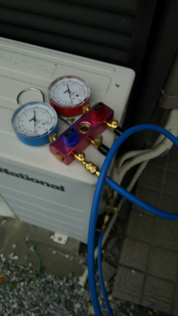 移設の為に、エアコンの中のガスを室外機に戻す作業中。